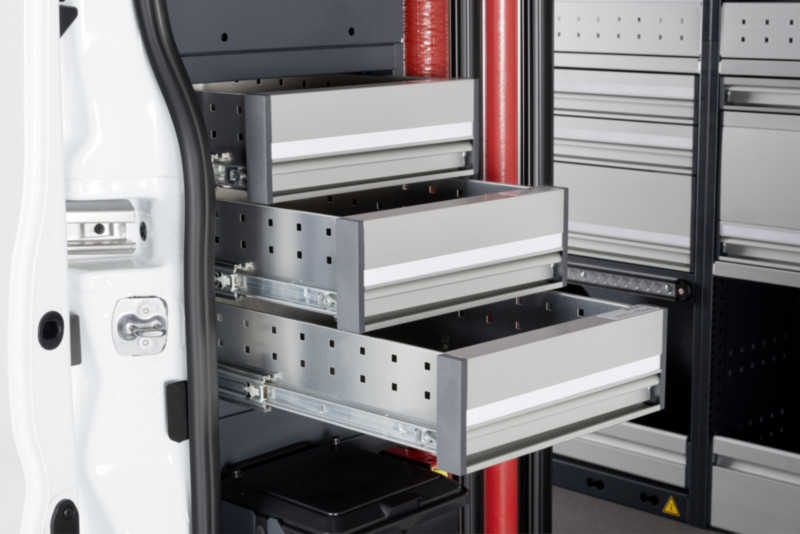 Apertura pratica veloce su tutta la larghezza grazie al listello d’impugnatura. Scopri il servizio di allestimento furgoni di Würth