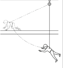L’effetto pendolo è un movimento oscillatorio incontrollato che può verificarsi quando un lavoratore è collegato a un ancoraggio con un sistema flessibile. Più ampio è lo spostamento laterale dal punto di ancoraggio, maggiore sarà l’effetto pendolo, con il rischio di impatto contro ostacoli. Per evitarlo, è necessario utilizzare un secondo punto di ancoraggio in abbinamento ad un cordino di trattenuta supplementare o una fune di deviazione, o installare fermi sul bordo della zona di lavoro. (fonti immagini norma UNI 11560:2022 cap. 5.2.4)